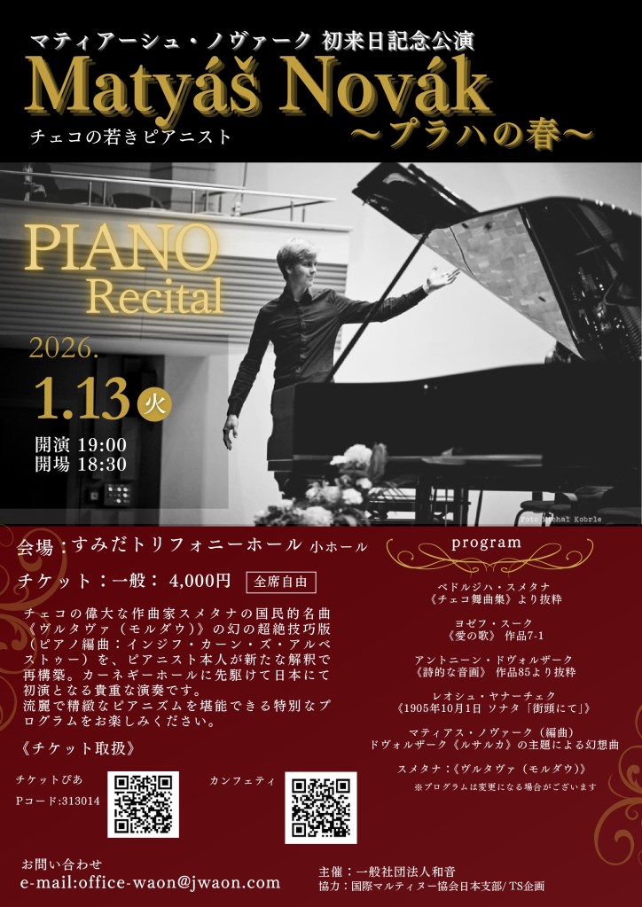出演を予定しておりましたピアニスト、マティアス・ノヴァーク氏の体調不良により、やむを得ず中止(延期)とさせていただくこととなりました。